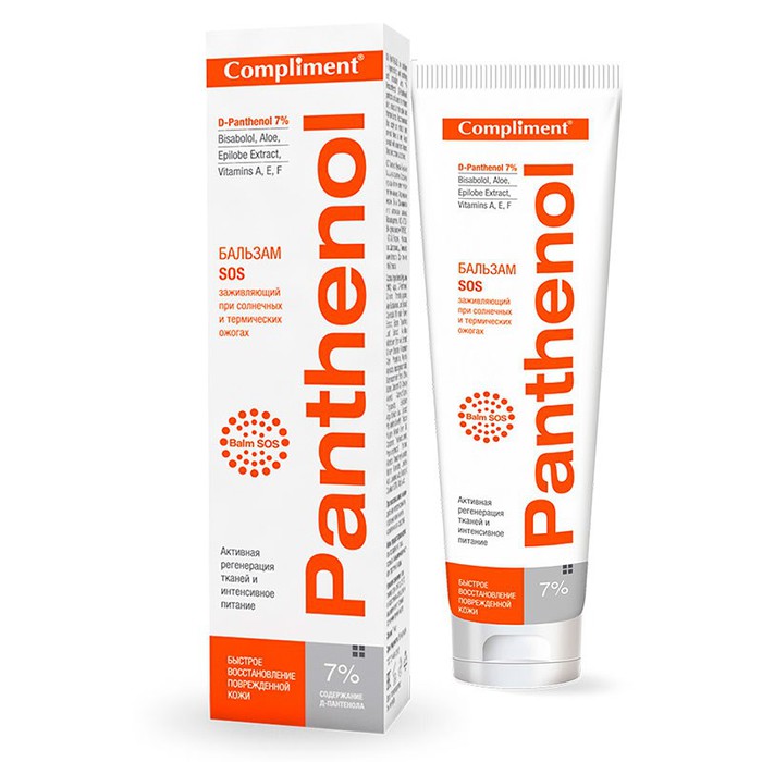 Бальзам SOS Пантенол Compliment разработан специально для стимуляции регенерации тканей кожи после солнечных или термических ожогов, оказывает метаболическое и противовоспалительное действия.