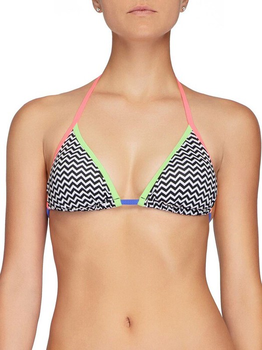 Трусики бикини с завязками на бедрах – классическая пляжная модель. Изюминка этого купальника в сочетании монохромного принта зигзаг и яркой цветной окантовки.