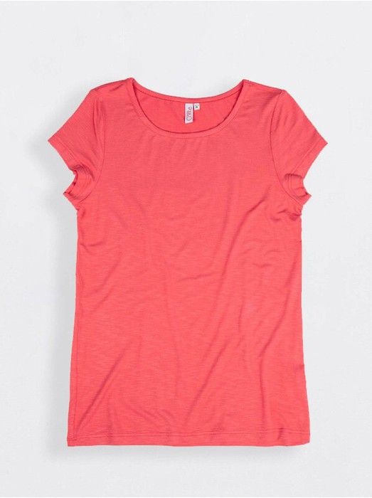 Джемпер женский из однотонного трикотажного полотна с эффектом "фламме" с коротким втачным рукавом. Круглая головина изделия окантована бейкой.