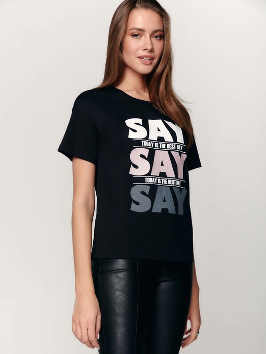 Черная футболка прямого силуэта LD 1229 из мягкого хлопка сочетает в себе минимализм и оригинальные тенденции уличной моды. · прямой силуэт· круглый вырез горловины· спущенная линия плеча· короткий рукав с отложным цельнокроеным манжетом· рисунок «Say»· мягкий 100% хлопок· устойчивый цвет и сохранение формы при соблюдении рекомендаций по уходу· прекрасный вариант на каждый день.