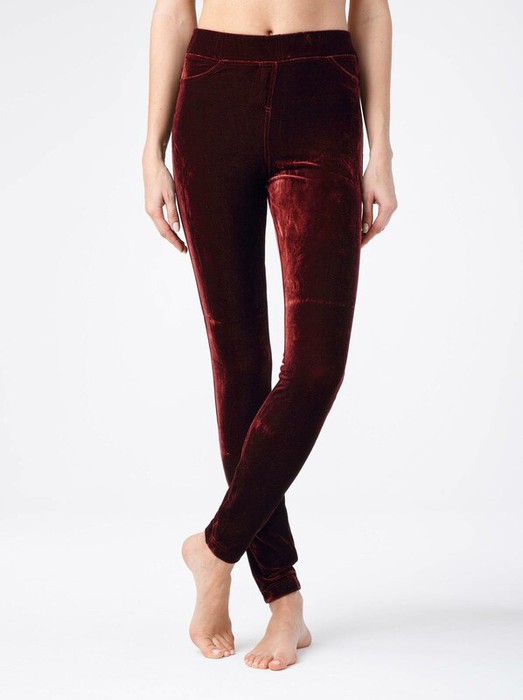 Леггинсы женские облегающие c боковыми швами. По переду изделия - имитация гульфика и боковых карманов. По задней части леггинсов - кокетки и накладные карманы. Боковые швы, гульфик, имитация боковых карманов переда, накладные карманы, кокетки задней части и шов сидения с двумя рядами отделочных строчек. Верх изделия обработан широким поясом с широкой резинкой внутри. Шов притачивания пояса с отделочной строчкой.