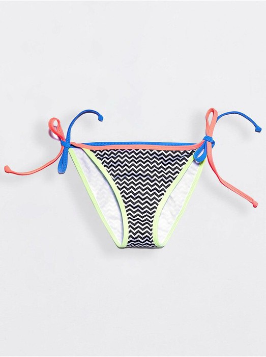 Трусики бикини с завязками на бедрах – классическая пляжная модель. Изюминка этого купальника в сочетании монохромного принта зигзаг и яркой цветной окантовки.