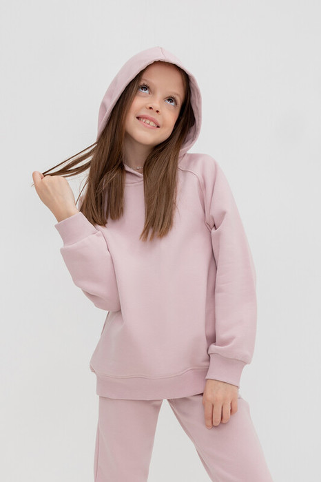 Толстовка с капюшоном для девочки из футера с начесом. В составе 80% натурального хлопка и 20% полиэстера, при этом полиэстер ввязан внутрь по особой технологии и не соприкасается с кожей. Манжеты и пояс из эластичного трикотажа.