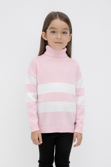 Вязаный джемпер для девочки из мягкой полушерстяной пряжи. Высокий воротник с отворотом хорошо защищает от холода. Длинные рукава с манжетами. Внизу эластичный пояс. Изделие сохраняет форму и стойкий цвет после многочисленных стирок.
