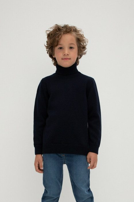 Вязаный джемпер для мальчика из мягкой полушерстяной пряжи. Высокий воротник с отворотом хорошо защищает от холода. Длинные рукава с манжетами. Внизу эластичный пояс. Изделие сохраняет форму и стойкий цвет после многочисленных стирок.