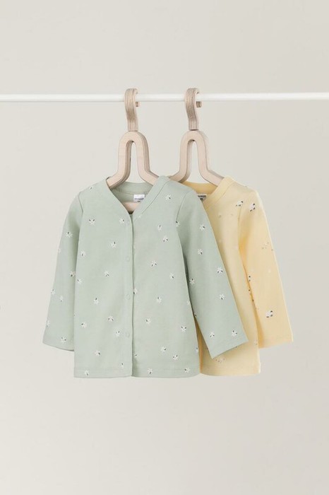 Кофточки для новорождённых из мягкого эластичного трикотажа интерлок, произведённого из натурального хлопка. В упаковке 2 штуки. Застёгиваются спереди на кнопки. В размере 56 на рукавах предусмотрены отвороты, швы выполнены наружу. Оригинальная набивка выполнена из стойких гипоаллергенных текстильных красителей. Все трикотажные полотна производятся в соответствии с нормами Швейцарского сертификата ЭкоТекс.