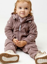 Флисовый комбинезон для девочки со съёмным капюшоном. Капюшон регулируется по ширине с помощью эластичной утяжки со стопперами. Подклад выполнен из гладкого трикотажа супрем, произведённого из высококачественного натурального хлопка. Застёгивается на удлинённую молнию с мягкой защитой шеи и подбородка. В размерах 62, 68 и 74 на рукавах и ножках есть отвороты. Украшен декоративными ушками и нашивкой. Комбинезон сохраняет цвет и форму после многократных стирок.