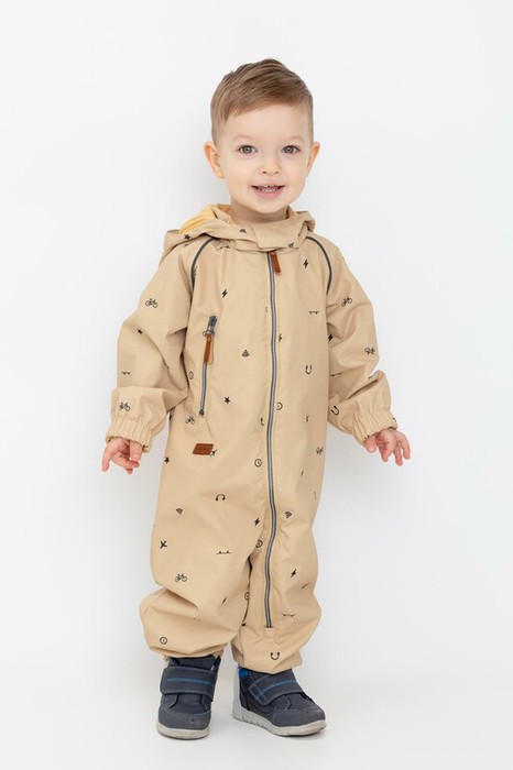 Ветровочный комбинезон ясельный из мембранной ткани с дополнительной тефлоновой обработкой. Данный вид обработки предохраняет изделие от загрязнения и лучше отводит влагу. Подклад из 100% хлопка. У изделия удлиненная молния для легкого одевания с защитой подбородка. Утяжка на капюшоне с потайными стопперами. По низу рукавов и брючин, а также на спинке изделия эластичная резинка для лучшего прилегания. Для фиксации комбинезона используются съемные силиконовые штрипки. В размерах  74-80 функциональные отвороты на рукавах и брючинах. Во всех изделиях верхнего ассортимента для безопасности ребенка предусмотрены светоотражающие элементы.