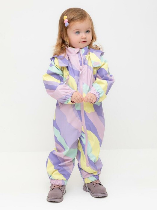 Ветровочный комбинезон ясельный из мембранной ткани с дополнительной тефлоновой обработкой. Данный вид обработки предохраняет изделие от загрязнения и лучше отводит влагу. Подклад из 100% хлопка. У изделия удлиненная молния для легкого одевания с защитой подбородка. Утяжка на капюшоне с потайными стопперами. По низу рукавов и брючин, а также на спинке изделия эластичная резинка для лучшего прилегания. Для фиксации комбинезона используются съемные силиконовые штрипки. В размерах 68-74, 74-80 функциональные отвороты на рукавах и брючинах. Во всех изделиях верхнего ассортимента для безопасности ребенка предусмотрены светоотражающие элементы.
