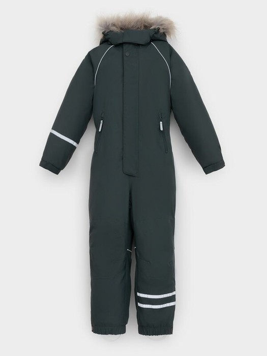Зимний комбинезон для мальчика с утеплителем Fellex®: 250 г/м2 . Выполнен из мембранной ткани с дополнительной тефлоновой обработкой, которая предохраняет изделие от загрязнений и отталкивает влагу. Подклад выполнен из 100% полиэстера Tricot. Комбинезон застёгивается на молнию и внешнюю планку на липучках и кнопках, предусмотрена защита подбородка. Съёмный капюшон имеет эластичную утяжку со стопперами и отстёгивающийся мех на молнии. Резинка по спинке обеспечивает лучшее прилегание. По бокам два кармана на молнии. Эластичные манжеты на рукавах  регулируются по ширине с помощью липучки, по низу изделия - с помощью кнопки. Внутренняя противоснежная юбка  защищает обувь от попадания снега и удерживает комбинезон в закреплённом положении. В размерах с 98-104 по 116-122  предусмотрены отстёгивающиеся штрипки. Во всех изделиях верхнего ассортимента для безопасности ребёнка предусмотрены светоотражающие элементы.