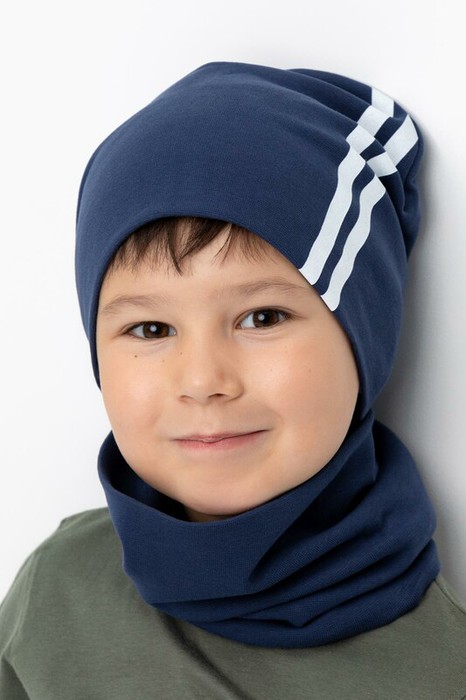 Комплект для мальчика - шапка и снуд из трикотажа рибана с эластаном. Шапка с удлинённой скругленной макушкой. Снуд сплошной. Украшены принтом со спортивными полосками.