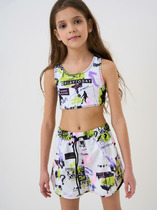 Раздельный купальник для девочки. Топ на эластичных лямках и плавки на резинке. Украшен воздушными оборками. Оригинальная набивка выполнена из стойких гипоаллергенных красителей.