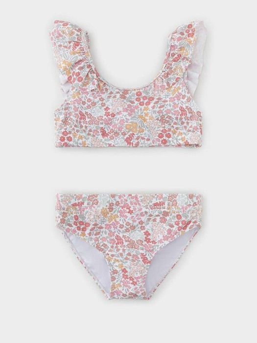 Раздельный купальник для девочки. Топ на эластичных лямках и плавки на резинке. Внутри подклад. Украшен воздушными оборками. Оригинальная набивка выполнена из стойких гипоаллергенных красителей.