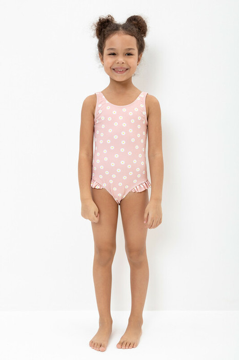 Слитный купальник на лямках для девочки. Украшен бантиками на лямках и оборками по бокам. Оригинальная набивка выполнена из стойких гипоаллергенных красителей.