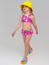 Слитный купальник на лямках для девочки. Украшен оборками. Внутри подклад. Оригинальная набивка выполнена из стойких гипоаллергенных красителей.
