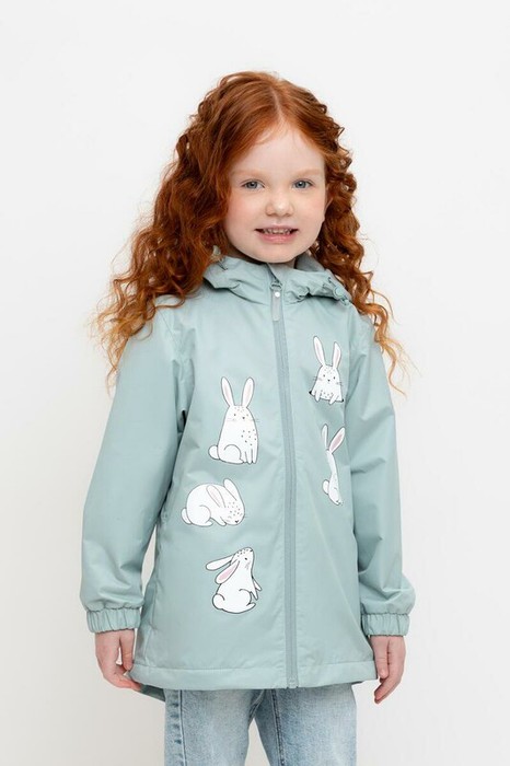 Куртка-ветровка без утеплителя. Верхняя мембранная ткань 1000/1000 с тефлоновым покрытием отталкивает воду и грязь и обладает «дышащими» свойствами. Подкладка - набивной трикотаж из 60% хлопка и 40% полиэстра в размерах 86-98 и однотонный 100% полиэстер - флис в размерах от 98-122. Застёгивается на молнию, предусмотрена защита подбородка. Дополнительная ветрозащитная планка внутри. Удлинённая спинка скруглена. Капюшон не снимается, украшен заячьими ушками, эластичный шнур утягивается и обеспечивает плотное прилегание к голове. На рукаве нашивка. Манжеты на резинке. Боковые карманы без застёжек. Светоотражающие элементы служат для безопасности в тёмное время суток.