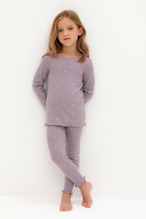 Трикотажная пижама в рубчик из натурального хлопка. Джемпер с длинными втачными рукавами и лосины с эластичной резинкой в поясе. Оригинальная набивка выполнена из стойких текстильных гипоаллергенных красителей. Изделие сохраняет цвет и форму после многократных стирок. Все трикотажные полотна производятся в соответствии с нормами швейцарского сертификата ЭкоТекс.