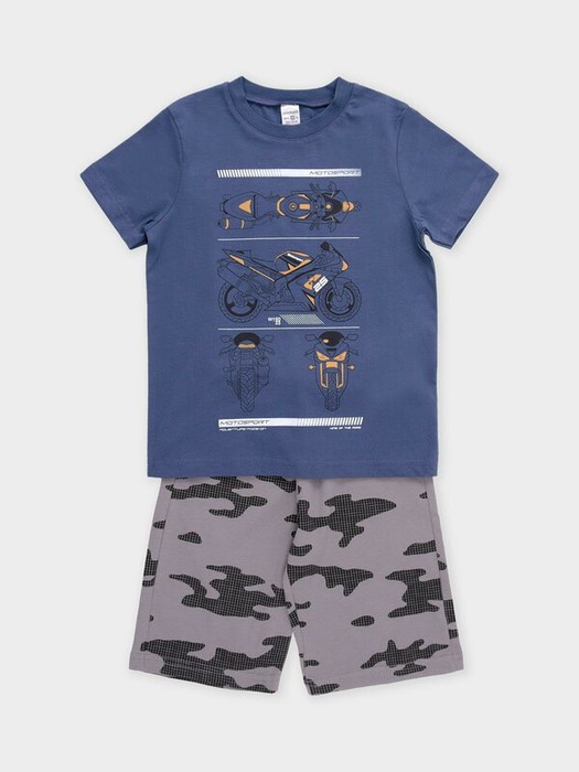 Пижама для мальчика из натурального хлопка. Футболка с короткими втачными рукавами и шорты с эластичной резинкой в поясе. Оригинальная набивка и принт выполнены из стойких текстильных гипоаллергенных красителей. Изделие сохраняет цвет и форму после многократных стирок. Все трикотажные полотна производятся в соответствии с нормами швейцарского сертификата ЭкоТекс.