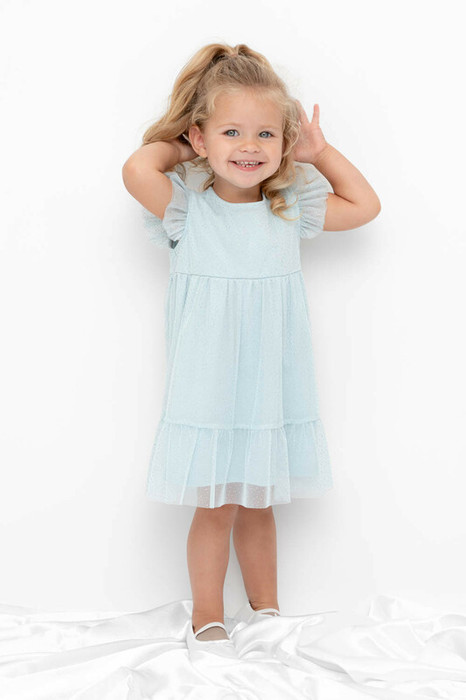 Нарядное платье для девочки из высококачественного трикотажа супрем с лёгким слоем из сетки с серебряными блёстками. Лиф украшен изящными крылышками из сетки. По низу изделия пришита широкая оборка. Для удобства одевания платье застёгивается на пуговицу на спинке. Платье сохраняет форму и стойкий цвет после многочисленных стирок и идеально подходит для праздников и фотосессий.