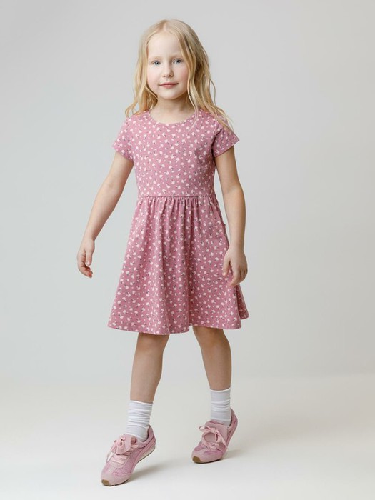 Платье с короткими рукавами и удобными карманами для девочки. Изготовлено из высококачественного гладкого трикотажа, произведённого из натурального хлопка. Для удобства одевания в размерах 92 и 98 на плече платье застёгивается на кнопки. Изделие сохраняет форму и стойкий цвет после многочисленных стирок и идеально подходит на каждый день. Все трикотажные полотна производятся в соответствии с нормами швейцарского сертификата ЭкоТекс.