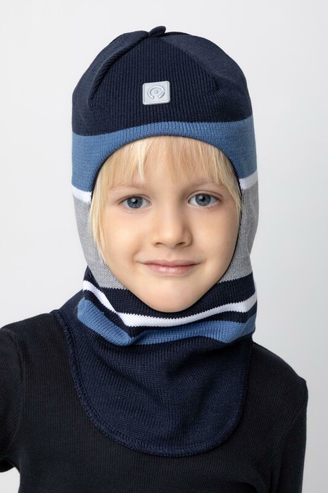 Шапка-шлем из акриловой пряжи с вывязанным полосатым рисунком. Внутри - мягкая подкладка из интерлока. Для безопасности в тёмное время суток на передней части шапочки прикреплён светоотражатель. На макушке рулик.