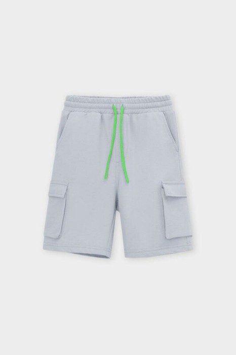 Трикотажные шорты для мальчика из высококачественного хлопка. Эластичный пояс регулируется при помощи шнурка. По бокам удобные карманы и два накладных кармана.