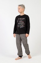 Трикотажный пижамный комплект из натурального хлопка. У футболки короткие рукава со спущенными плечами. Брюки с удобным поясом на резинке. Оригинальная набивка и принт выполнены из стойких, гипоаллергенных текстильных красителей. Все трикотажные полотна производятся в соответствии с нормами Швейцарского сертификата ЭкоТекс.