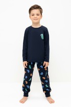 Трикотажный пижамный комплект из натурального хлопка. У джемпера длинные втачные рукава. Брюки с удобным поясом на резинке и атласной лентой . Оригинальная набивка и принт выполнены из стойких, гипоаллергенных текстильных красителей. Все трикотажные полотна производятся в соответствии с нормами Швейцарского сертификата ЭкоТекс.