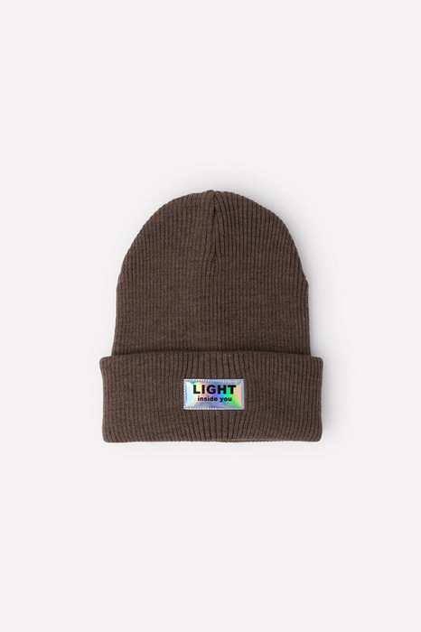 Тёплая вязаная шапка в тёмно-бежевом оттенке с высоким отворотом для девочки. На отвороте прикреплена блестящая нашивка с надписью.