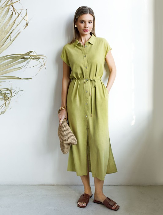 Длинное платье-рубашка с поясом и разрезами изо льна с вискозой