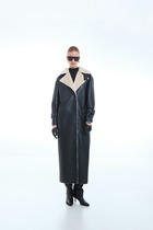 Дубленка женская прямого силуэта, двубортная, длиной до середины бедра. На переде карманы с настрочной листочкой, застежка на петли и пуговицы. Рукава длинные, двухшовные. Воротник и лацкана отложные. Правый лацкан можно застегивать на кнопку.