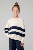 Трикотажный джемпер в полоску, декорированный кружевной аппликацией спереди. Прямой крой, круглый вырез горловины, длинные рукава-реглан.На ребенке представлен размер 140:- Ширина изделия по линии груди 39 см- Ширина по низу изделия 39,5 см- Длина рукава 59,5 см- Длина изделия 50,5 смРазница между размерами составляет 1,5 см.