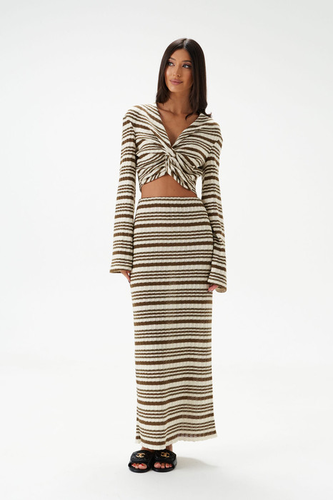 Джемпер прямого кроя выполнен из трикотажного полотна бежевого цвета в полоску с декоративным элементом в виде узла. Характеристики: прямой крой,глубокий вырез, рукав втачной, расширяется к низу. Длина изделия по спинке 41см, длина рукава от края горловины 83 см