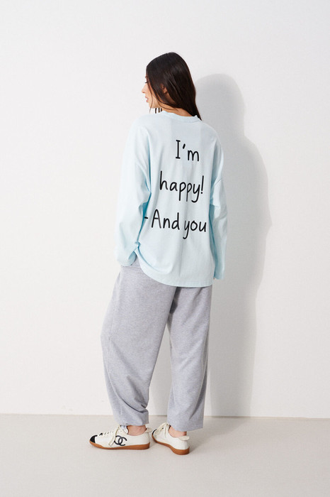 Джемпер прямого свободного кроя,выполнен из трикотажного полотна голубого цвета. Характеристики: прямой крой, овальный вырез горловины, горловины из довяза, спинка цельнокроеная, Принт "I'm happy! And you?", спущенное плечо, вточной длинный рукав. Длина по центру спинки 70 см, длина рукава от края горловины 76см.