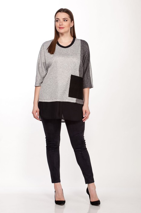Туника женская полуприлегающего силуэта, выполнена из трикотажа с добавлением спандекса,  с цельнокроеным рукавом. Полочка и рукав украшены сеткой на контрасте с основной тканью изделия. На полочке выполнен накладной карман из ткани контрастного цвета, по переду и спинке пришита отделка из тонкой полупрозрачной ткани. Длина туники по спинке 82 см.