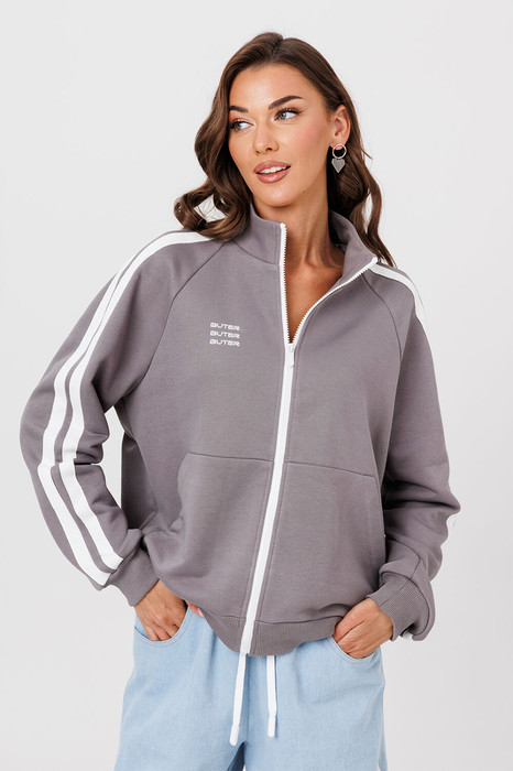 Джемпер трикотажный прямого силуэта с втачным длинным рукавом-реглан внизу на притачной манжете. Рукав с широкими настроченными лампасами. Полочка, с центральной застежкой на тесьму-молнию, карманом-кенгуру и печатью «BUTER». По низу джемпера притачная планка. Воротник-стойка. Джемпер без подкладки.