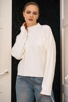 Джемпер, укороченный прилегающего силуэта, с втачным длинным одно шовным рукавом. Вырез горловины полочки каре на широкой обтачке.