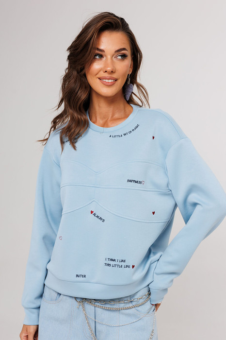 Джемпер из технологичного трикотажного полотна с эффектом peach. Прямого силуэта с втачным рукавом и спущенной линией плеча, с манжетой из основной ткани по низу рукава. Полочка с фигурными подрезами, имитирующими лиф и вышивкой. По горловине и низу изделия притачная планка из основной ткани.