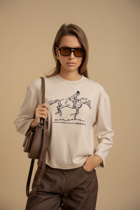 Джемпер женский свободного покроя из трикотажного полотна. Вырез горловины - неглубокий, округлой формы. Рукава - втачные ср спущенной линией плеча. Изделие декорировано авторской вышивкой.