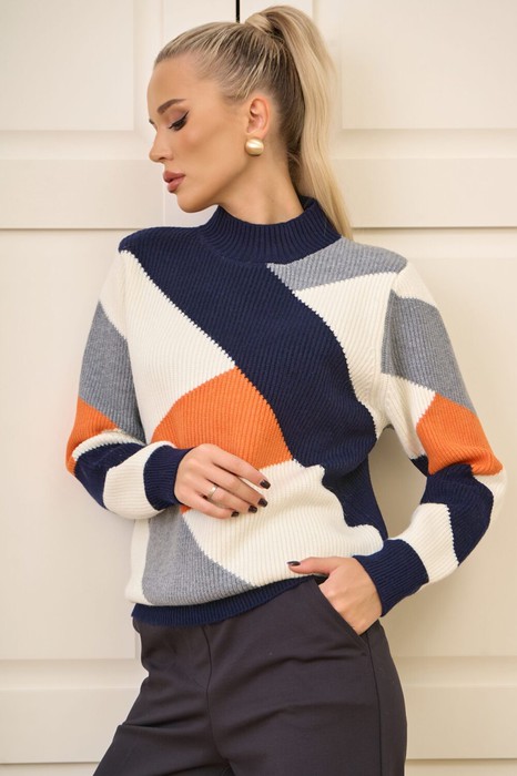 Стильный вязаный свитер “Коди” из рельефного трикотажа. Универсальные оттенки дополнены контрастными цветными блоками, которые делают образ современным и выразительным.
