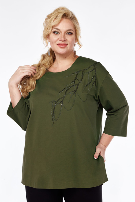 Джемпер женский, нарядный, прямого силуэта из трикотажного полотна. По переду выполнена декоративная вышивка. На спинке средний шов, в котором расположена застежка на навесную петлю и пуговицу. В боковых швах обработаны разрезы. Спинка удлиненная.