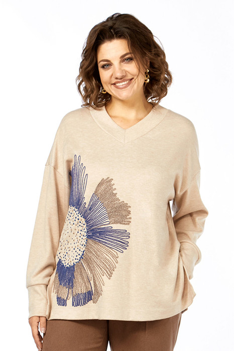 Джемпер свободного кроя, изготовлен из трикотажного полотна. Горловина V-образной формы. На полочке-вышивка. Спинка цельнокроенная. Рукава спущенные, с манжетами по низу. В боковых швах-разрезы.