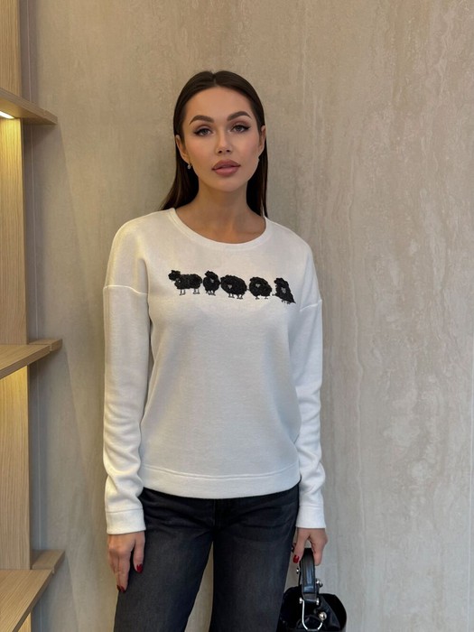 Джемпер женский прямого силуэта с округлой горловиной и спущенной линией плеча. По переду в области груди расположена авторская вышивка. Рукав длинный одношовный. Декоративные элементы и фурнитура могут отличаться от заявленных на фото.    Цвет материала может отличаться по тону в зависимости от настроек вашего монитора!