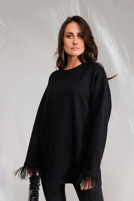 Стильный лонгслив с перьями на рукавах. Линия плеча спущенная. Перья сьемные, для удобства в стирке, и смены образа. Самая универсальная вещь для вашего гардероба, его можно надеть на вечеринку или свидание, а сняв перья носить в повседневной жизни.