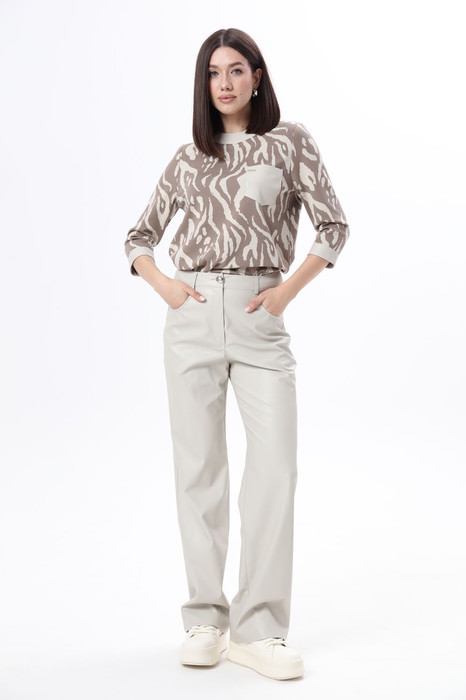 Трикотажный джемпер свободного кроя с укороченными рукавами. По переду расположен карман  из мягкой эко-кожи. Горловина и манжеты низа рукавов также декорированы эко-кожей. По переду нагрудные вытачки. Застёжка на потайную молнию по спинке.