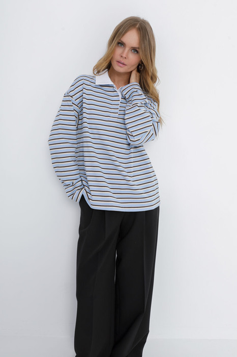 Свободный трикотажный джемпер в полоску с контрастным воротником-поло.