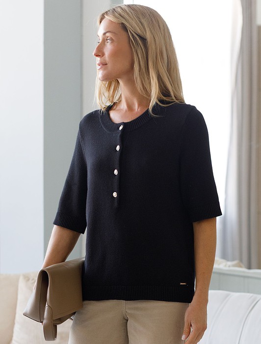 Состав: 70%Хлопок 21%ПА 9%Кашемир Размер товара на первом фото: 42Джемпер тонкой вязки выполнен из хлопка с добавлением кашемира. Модель с круглым вырезом дополнена золотистыми пуговицами. Мягкая и очень приятная пряжа совершенно не колется, сохраняет тепло при этом не перегревая, гарантируя безупречный комфорт.