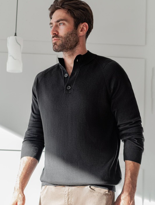 Состав: 55%Хлопок 45%ПАН (акрил) Параметры модели на первом фото: Рост 190, бюст 108, талия 87, бедра 104Черный джемпер с воротом, застегивающимся на черепаховые пуговицы, связали из мягкого хлопка с добавлением акрила; состав, который отлично согревает, не колется и при этом не перегревает тело, поэтому вещь получилась максимально комфортной для переменчивой погоды. Повседневный образ поддержат светлые брюки, синие джинсы и броги.