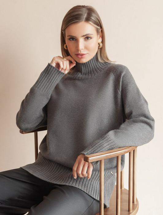 Джемпер с воротом стойка выполнен из мягкой пряжи с кашемиром. Модель свободного силуэта с рукавом реглан будет стильно сочетается с брюками и джинсами. Мягкая пряжа очень приятная к телу, поддержит комфорт на протяжении всего дня, при этом не перегревая. Сочетается в костюме с брюками D38.013, D38.012 и юбкой D36.016