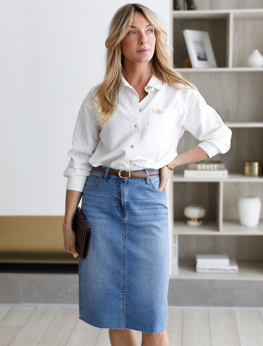 Состав: 79%Хлопок 16%ПЭ 5%ПУ Плотность: 12 OZЭффектная джинсовая юбка синего цвета плотностью 12 OZ создана для тех, кто ценит стиль и комфорт в любое время года. Благодаря эластичному дениму модель отлично садится по фигуре и дарит свободу движений даже в жаркие дни. Декоративная стирка придает изделию современный вид, подчеркивая индивидуальность обладательницы и делая образ актуальным на весну и лето. Лаконичный разрез сзади добавляет оригинальности и визуально удлиняет силуэт, а длина чуть ниже колена делает эту вещь универсальной для самых разных случаев. Модель особенно удобна тем, что подходит на большие размеры, обеспечивая отличную посадку по фигуре без чувства стеснения.